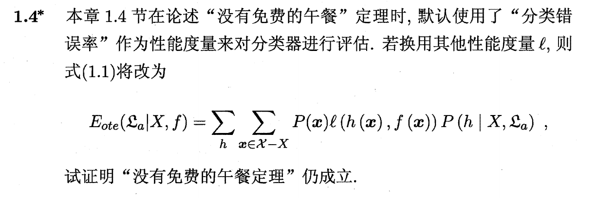 E_{\text {ote }}\left(\mathfrak{L}_{a} \mid X, f\right) &=& \sum_{h} \sum_{\boldsymbol{x} \in \mathcal{X}-X} P(\boldsymbol{x}) \ell(h(\boldsymbol{x}), f(\boldsymbol{x})) P\left(h \mid X, \mathfrak{L}_{a}\right) \\ &=& \sum_{\boldsymbol{x} \in \mathcal{X}-X} P(\boldsymbol{x}) \sum_{h}P\left(h \mid X, \mathfrak{L}_{a}\right) \sum_{f} \ell(h(\boldsymbol{x}), f(\boldsymbol{x})) \\ &=& \sum_{\boldsymbol{x} \in \mathcal{X}-X} P(\boldsymbol{x}) \sum_{h}P\left(h \mid X, \mathfrak{L}_{a}\right) A1.5