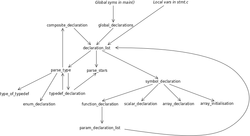 int a, *b, c[40], *d[100];So in declaration_list() we loop for each declaration in the list.