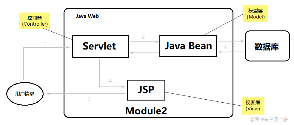 首先用户的请求会到达 Servlet,然后根据请求调用相应的 Java Bean,并把所有的显示结果交给 JSP 去完成,这样的模式我们就称为 MVC 模式。